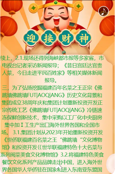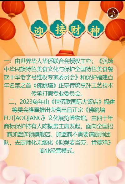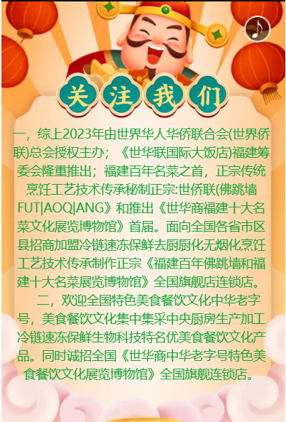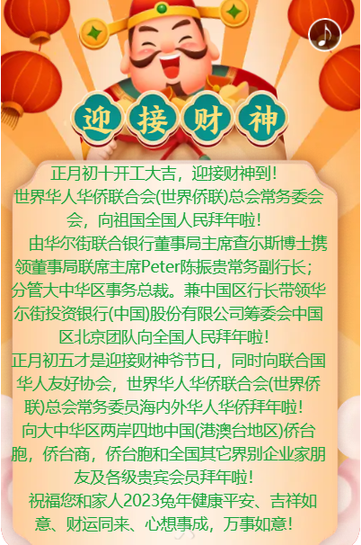 正月初十开大吉,迎财神到。由世界华人华侨联合会授权主办;世华联国际大饭店福建筹委会,2023免年隆重推出共亨《世华商酒店餐饮酒楼)》开市大吉。迎接财才神到来!