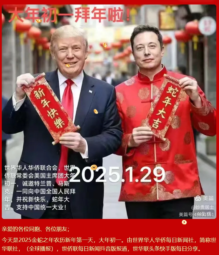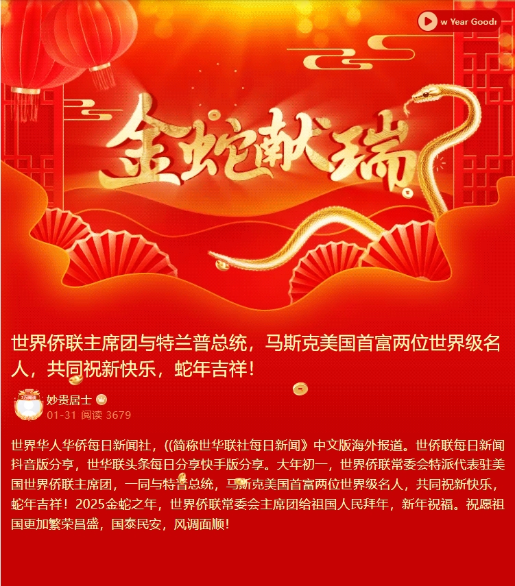 世界侨联主席团与特兰普总统,马斯克美国首富两位世界级名人,共同祝新快乐,蛇年吉祥!