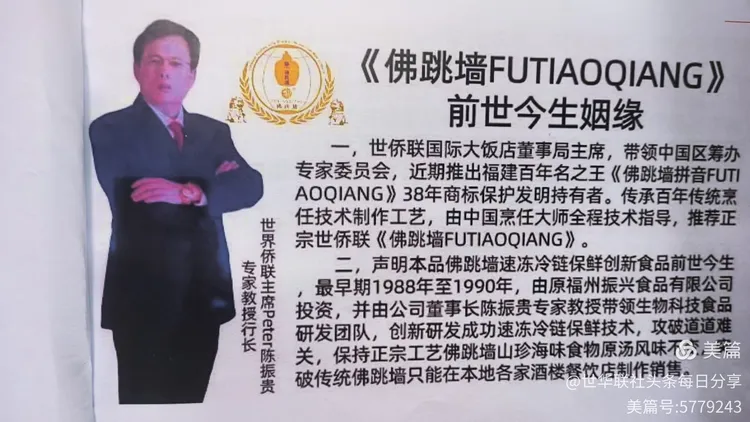 2025年6月27日下午,一场关乎中华美食文化传承与创新与央视媒体纪录新时代坚守匠心路的盛会在北京国家农业农村部录制大厅盛大举行。由世界华人华侨联合会、中国两岸文化经贸交流协会、世界侨联常委会共同授权主办,世侨联国际大饭店(定位超五星级大型酒店)大中华区董事局主席陈振贵专家教授受邀来北京参加的《记录新时代坚守匠心路》现场会议厅,会议现场摆放聚焦福建百年名菜佛跳墙的守正创新之路。值得关注的是,拥有38年佛跳墙中文拼音+英文商标发明与保护权的世界侨联常委会主席团主席陈振贵专家教授,应中央电视台央视新闻媒体工匠精神栏目编导组的诚挚邀请,携传承百年饮食智慧的佛跳墙亮相现场,与行业精英、文化学者共同探讨中华美食的现代化传承密码。