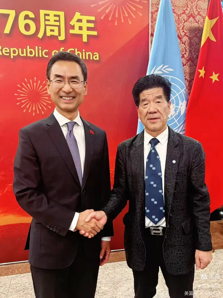 图为世界侨联国际外交派驻美国侨领事务馆高级顾问李贵明与中国常驻联合国代表张军领导合影留念
